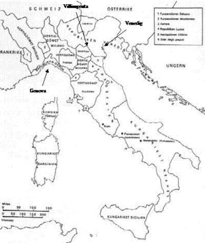 Vid den tidpunkten när Napoleon invaderade Norditalien, i 1795 fanns, förutom ett antal mindre hertigdömen under Österrikes välde, även republikerna Genova och Venedig. Om någon vid den tiden skulle färdas från Genova till Po-dalen i trakterna av Rovigo, så hade de fått resa från Genova genom hertigdömena Parma och Mantua innan de kom till republiken Venedigs domäner. Vi vet givetvis inte om familjen Marconinis gård låg inom republikens område eller om den låg i något av de angränsande hertigdömena Milano, Mantua eller Ferrara.