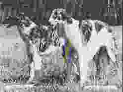 Murugi started out with 3 bitch lines and had as a goal to breed these into one line containing the qualities they wanted. The three bitches were, Ekhaga Irina, Ekhaga Piroschka and the imported Eng. Ch Falconcrag Esmerarna, all three seen on top of this page. The kennel only kept few stud dogs, but always relied on the best studs on the market, in particular they used Int. Ch Don-Cosackens Chardaz. Three borzois were imported as complements to the Ekhaga lines, the above-mentioned Eng. Ch Falconcrag Esmerarna, who came direct from winning her fourth English certificate at the Crufts Show in London. Ekhaga Irina and Ekhaga Piroschka. To the right Is Falconcrag Esmerarna.